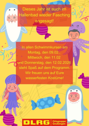 in der Woche vom 09. Februar bis 12. Februar 2026 findet bei uns in den Schwimmkursen das alljährliche Faschingsschwimmen statt. Gerne dürft ihr euch richtig cool verkleiden.